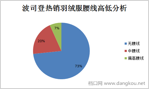 波司登女士羽绒服的腰线高低处理方式,无腰线设计占比73%,高于平均水平。中腰线的应用比重较平均值偏低,而偏高腰线的应用有所增加。