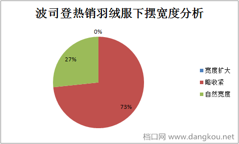 波司登女士羽绒服略收紧式下摆占73%,自然宽度下班占23%,表明该品牌在女士羽绒服的开发上偏重于略收紧式下摆的开发,而在宽度扩大式下摆上鲜有涉及。