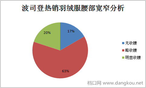 波司登在女士羽绒服的腰部宽窄方面与品牌女士羽绒服腰部宽窄设计的整体设计情况大致相同,只是相对更偏重略收腰的设计风格,而在明显收腰和无收腰两种羽绒服腰部宽窄的处理上较整体情况有所减弱。