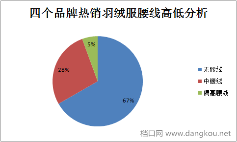 综上所述,在女士羽绒服的腰线处理上,四个品牌的整体情况偏重于对无腰线的处理方式,而在单个品牌中,鸭鸭品牌的情况比较特殊,表现出对无腰线好中腰线大体相同的重视程度。