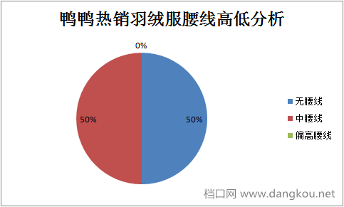 鸭鸭品牌女士热销羽绒服的腰线高低处理方式中,无腰线设计以及中腰线设计各占比50%,对较高腰线处理方式的使用则较少设计。在与整体品牌热销女士羽绒服对腰线高低处理情况相比时可发现,鸭鸭品牌对无腰线的处理方式偏好有所减弱,而对中腰线的设计方式偏好有所加强。