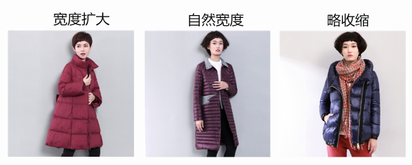羽绒服的下摆宽度主要体现在:宽度扩大、略收紧、自然宽度三个方面,实际设计应用过程中,大部分热销羽绒服下摆宽度比例相当。