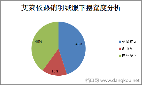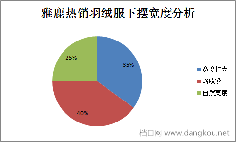鸭鸭品牌在女士羽绒服的下摆宽度设计方面,则比较注重宽度扩大式下摆设计,该项占比达55%,另外自然宽度下摆设计占比35%,略收紧式下摆只有10%。
