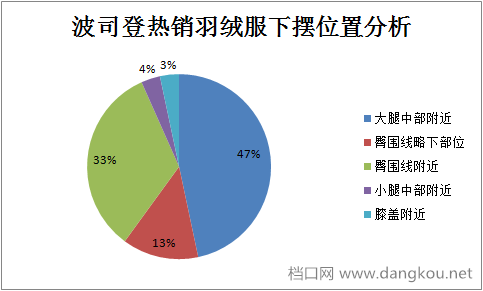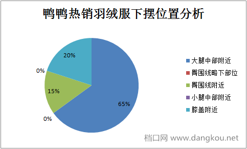 鸭鸭热销女士羽绒服下摆设计中,除了位于大腿中部的中长款设计依然占据65%的绝对比例外,主要为位于膝盖附近的长款下摆设计以及臀围线附近的短款设计。