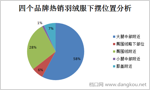 综上所示,在女士羽绒服下摆位置设置方式中,无论是四个品牌整体情况还是单个品牌,都偏重于将女士羽绒服下摆位置设置于大腿中部附近,对应的主流款式长度为中长款羽绒服。