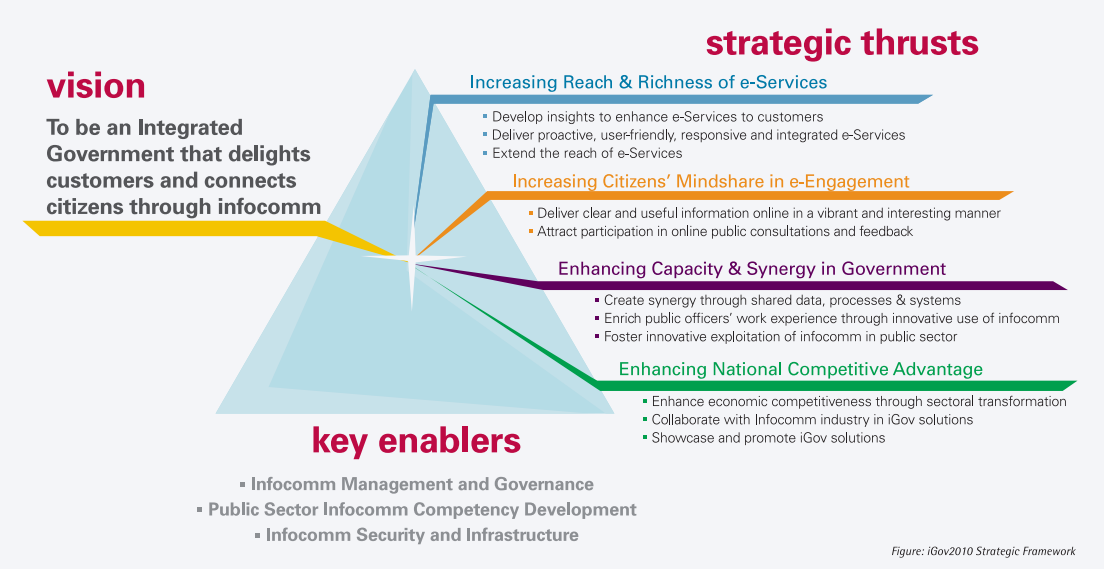 2006年,iGov2010年愿景诞生,计划从一个集成化电子政务的政府,发展为高度集成管理的政府。通过信息技术连接民众,提升服务满意度。该计划要求所有职能部门改进政务系统的后端流程,增强以用户为中心的服务能力。
