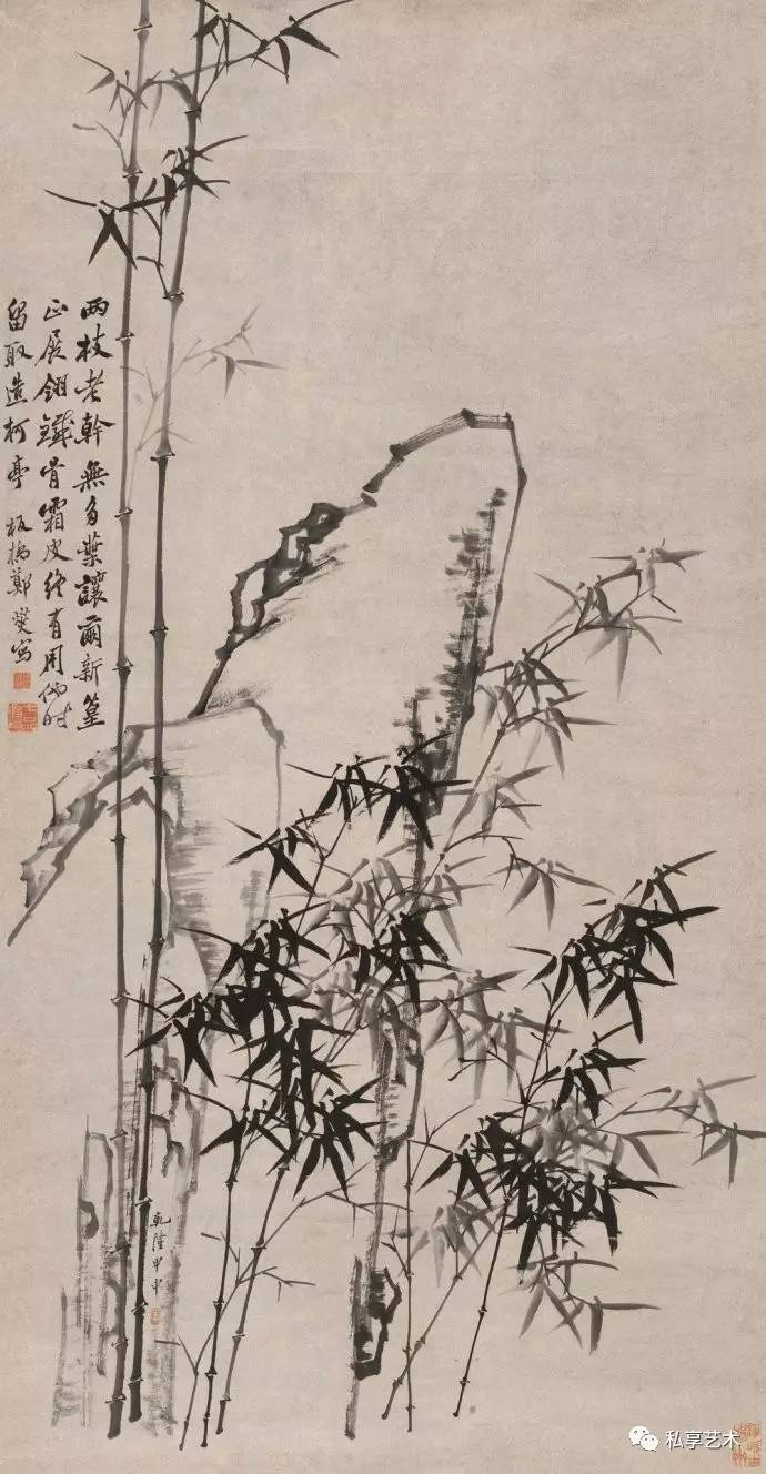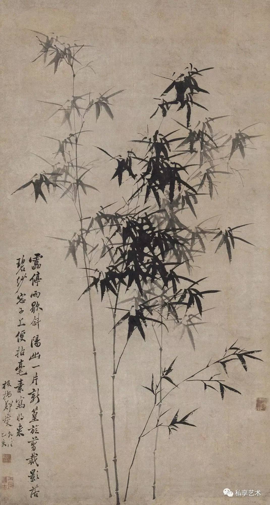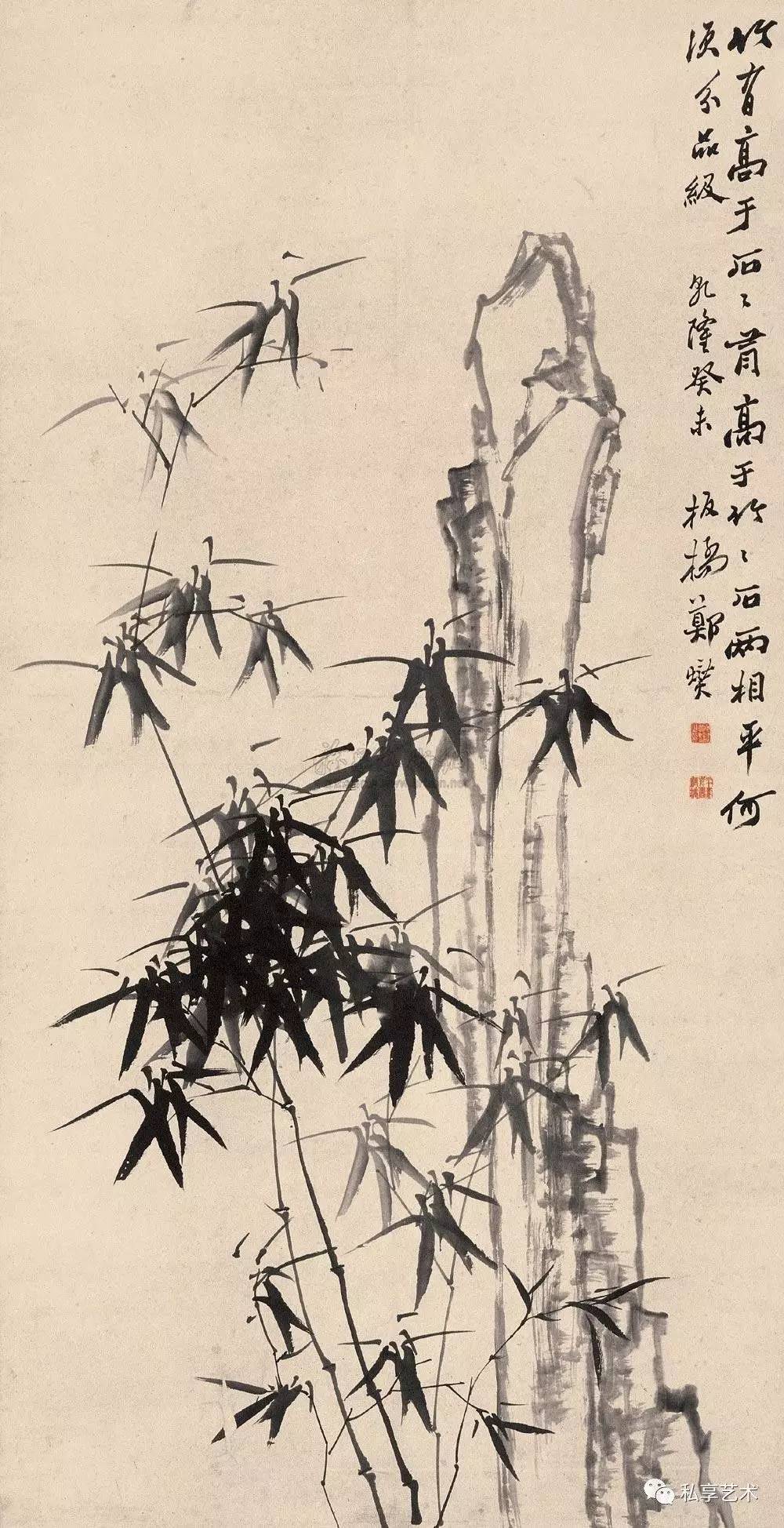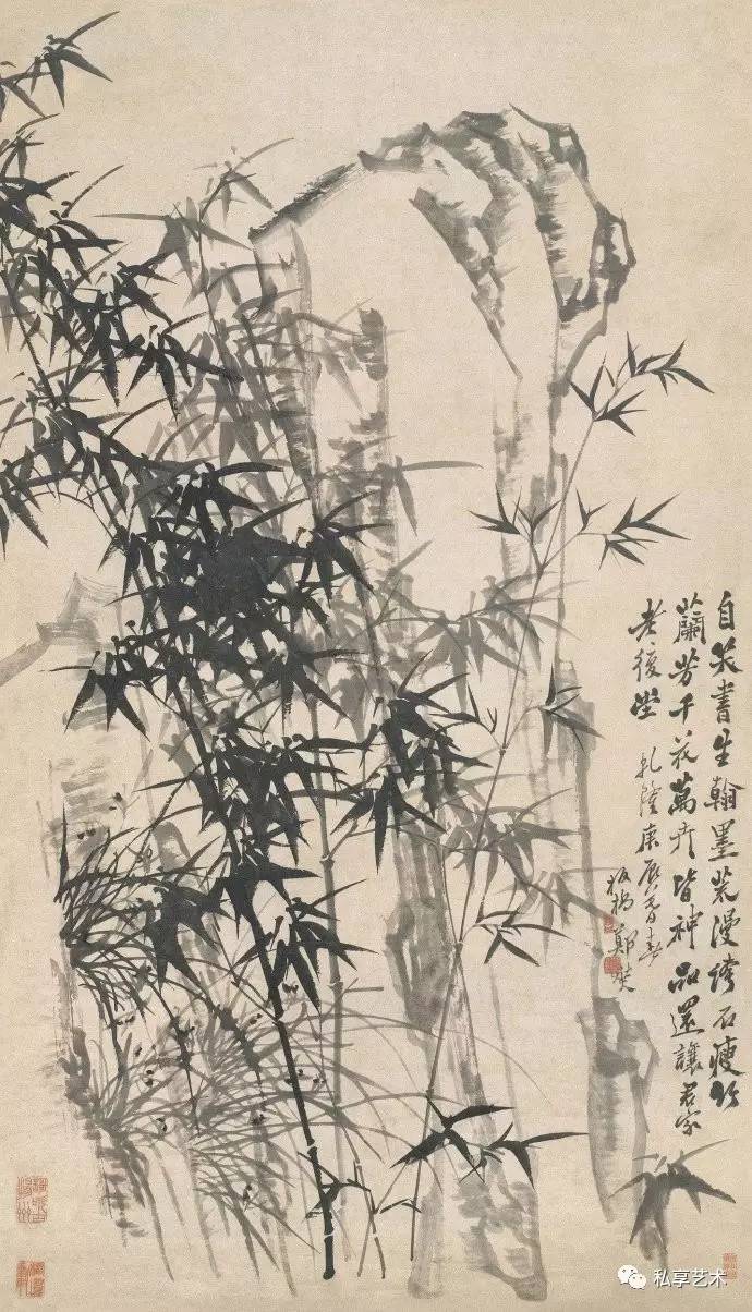 在专业人士眼中,郑板桥的墨竹具有非凡的艺术魅力, 齐白石曾评:“真而且妙”。虽然郑板桥在乾隆戊寅( 1758年) 作《墨竹》(中国嘉德2009秋拍,324.8万元成交)中曾题:“凡吾画竹,无所师承,多得于纸窗粉壁日光月影中耳。”而 实际上他画竹是在勤于观察的基础上,融入了自己对先贤画 竹名家的理解。在另一首题画诗中,他说到:“徐文长、高 且园两先生不甚画兰竹,而燮时时学之弗辍,盖师其意不在 迹象间也。文长、且园才横而气豪,而燮亦有倔强不驯之气, 所以不谋而合”,还有“画竹曾经学石涛,近来老笔转萧萧。 无多竹叶无多干,自有清风纸上飘”。