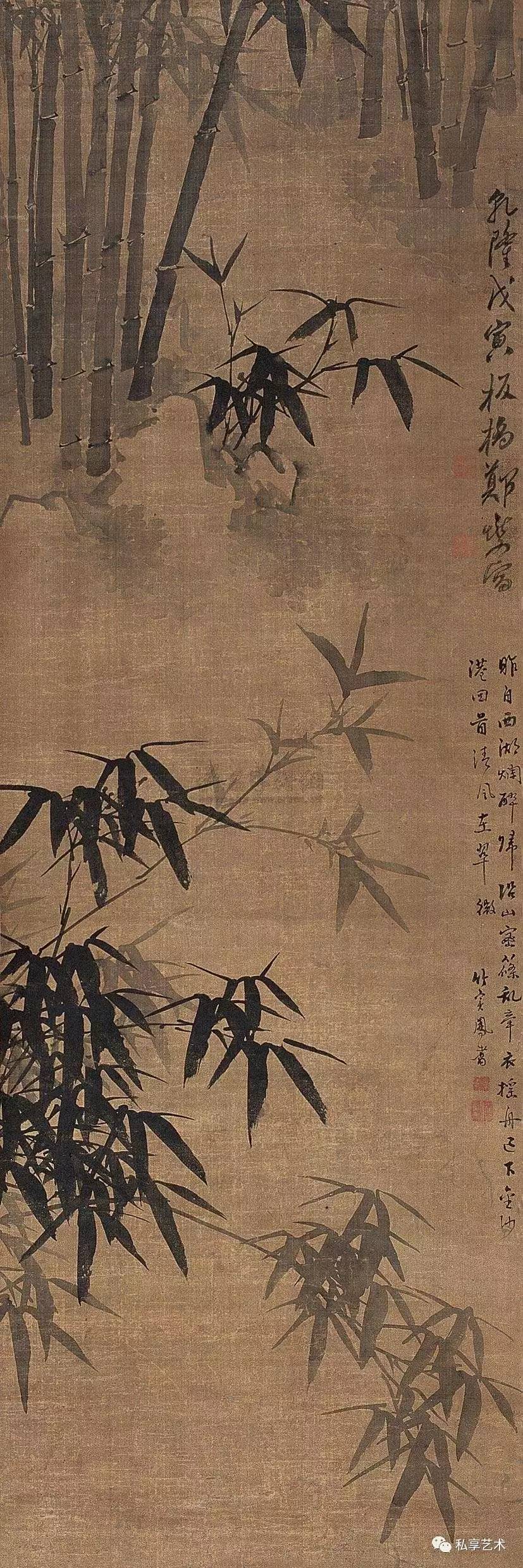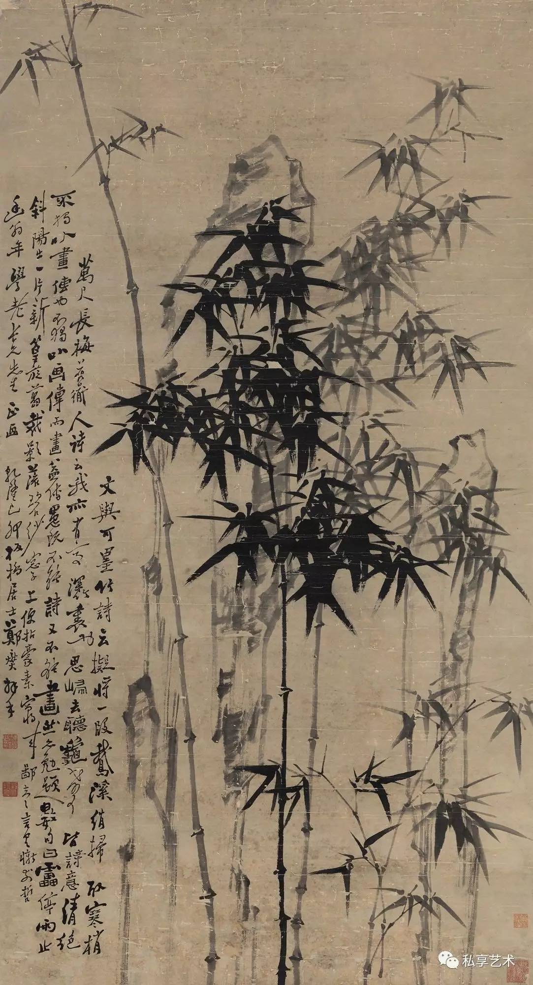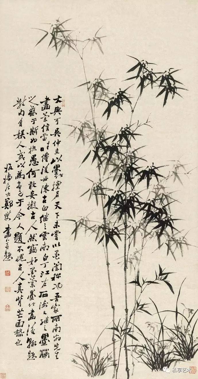 在专业人士眼中,郑板桥的墨竹具有非凡的艺术魅力, 齐白石曾评:“真而且妙”。虽然郑板桥在乾隆戊寅( 1758年) 作《墨竹》(中国嘉德2009秋拍,324.8万元成交)中曾题:“凡吾画竹,无所师承,多得于纸窗粉壁日光月影中耳。”而 实际上他画竹是在勤于观察的基础上,融入了自己对先贤画 竹名家的理解。在另一首题画诗中,他说到:“徐文长、高 且园两先生不甚画兰竹,而燮时时学之弗辍,盖师其意不在 迹象间也。文长、且园才横而气豪,而燮亦有倔强不驯之气, 所以不谋而合”,还有“画竹曾经学石涛,近来老笔转萧萧。 无多竹叶无多干,自有清风纸上飘”。