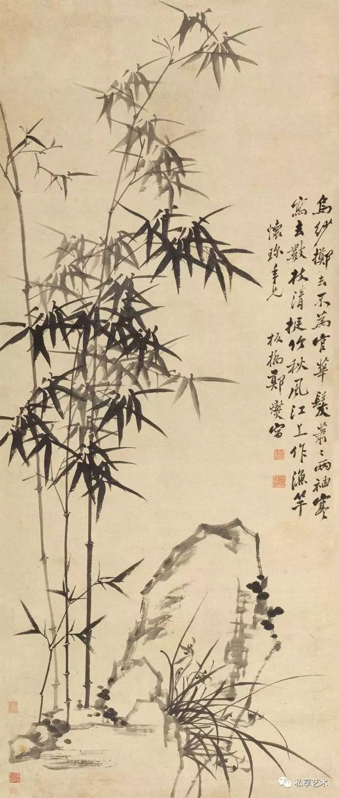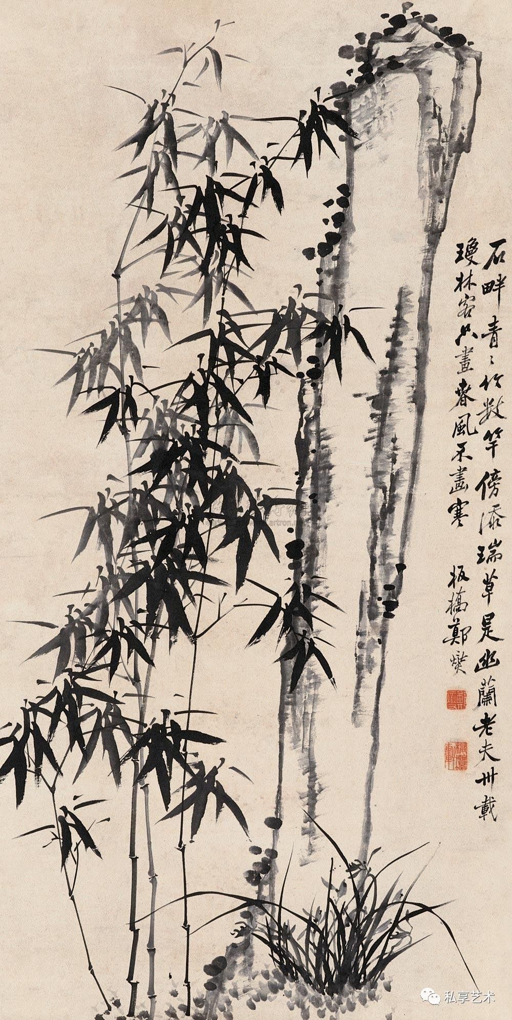 同样源于这样的平等 思想,以“慰天下劳人”为创作宗旨的郑板桥,还让竹 画的功用获得了扩展。1756年,他颇有新意地以一幅《竹石兰蕙图》(中国嘉德2004年秋拍,539万元成交)为刘母卞太君八十荣庆祝寿,并题诗;“南山献寿高千尺,劲节清风觉更高。积行人家天所佑,兰荪蕙种自能铙。”赞扬老人积德行善,为天所佑。