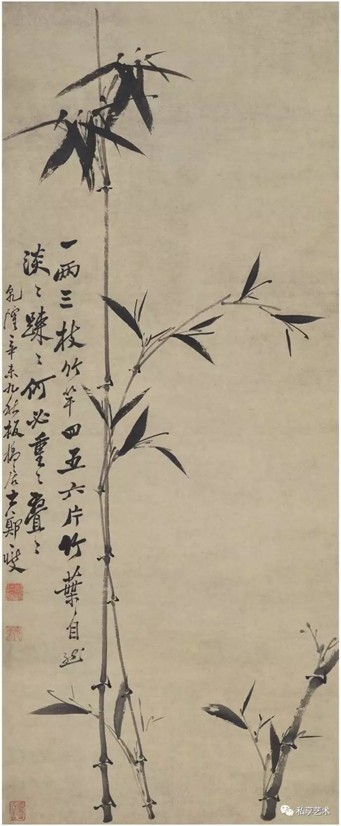 从传世的郑板桥墨竹画作可见,其间竹子昂扬劲健, 无病无灾,枝叶清晰,枝干舒朗,构图简洁,可见板桥 绘竹从不卖弄技巧,故弄玄虚,以求观者一目了然,而 这也并未妨碍板桥之竹在美术史上的高蹈地位。
