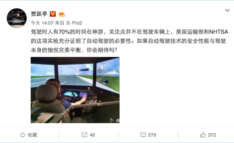 在微博中,贾跃亭写到:“驾驶时人有70%的时间在神游,关注点并不在驾驶车辆上,美国运输部和NHTSA的这项实验充分证明了自动驾驶的必要性。如果自动驾驶技术的安全性能与驾驶本身的愉悦完美平衡,你会期待吗? ”