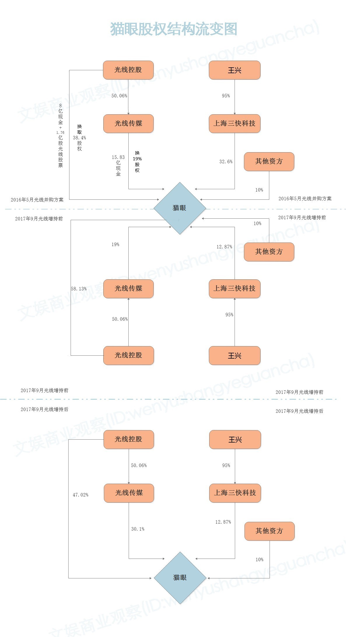 在2016年5月份那次大并购的时候,王长田用23.83亿元的现金和价值23.99亿元的光线传媒股票,换来了猫眼57.4%的股权。