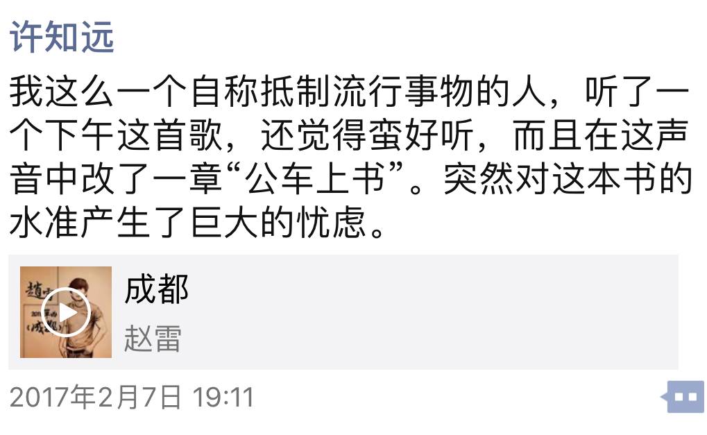 根据微在编辑部的爆料,就在今年2月赵雷登上《歌手》、《成都》烂了大街以后,许知远曾把赵雷的这首《成都》转发到了他个人的朋友圈,并配上了一段意味深长的评价: