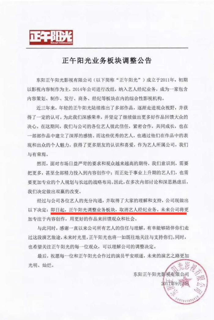 9月5日,正午阳光影业通过微博发布《正午阳光业务板块调整公告》:通过对于市场的分析并与艺人沟通,公司将取消艺人经纪,未来将更加专注于内容创作,用更好的作品来回馈观众与社会。