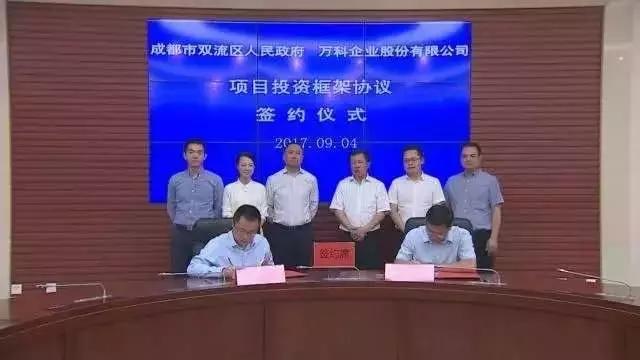 2017年9月4日,万科梦想城项目签约仪式在双流区举行。双流区委书记周先毅,双流区委常委、总工会主席韩超,万科集团高级副总裁、中西部区域首席执行官王海武,万科集团中西部区域党委书记廖荠雪见证签约。