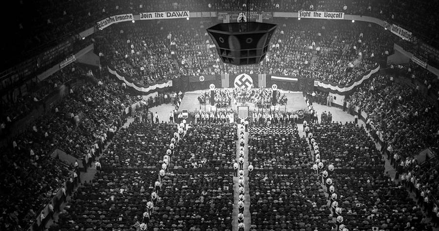 ▲ 1934年的纽约,麦迪逊广场花园一处,约有2000人聚集于此,他们是美国纳粹组织“新德国之友”(Friends of New Germany)的成员。 GETTY IMAGES