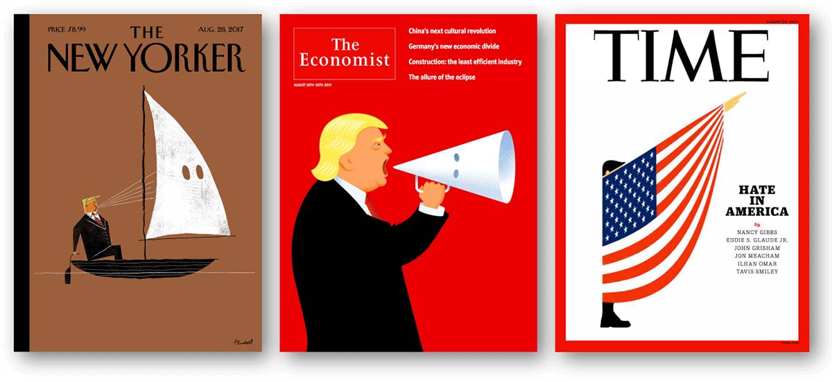 ▲ “弗州骚乱”后,特朗普在公开发言中称“两方都有责任”。随后的《纽约客》、《经济学人》杂志封面中,将特朗普和3K党元素置于一起;《时代》则回顾了美国的“仇恨史”,封面为星条旗包裹着一个纳粹手势的人。
