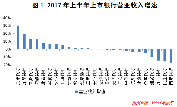 分银行看,25家上市银行中,营收增速最快的是贵阳银行,2017年上半年同比增长29.99%(参见图1)。在2016年年末的时候,贵阳银行也是营收增速最快的银行。同期,南京银行的营收下滑明显,2017年上半年营收同比下降17.04%,具体来看,其营收增速下滑主要是手续费及佣金净收入(非利息收入)同比下降38.6%所致。