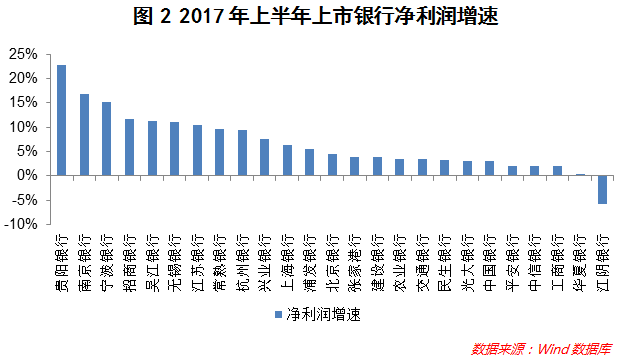 净利润增速方面,25家上市银行中,净利润增速最快的是贵阳银行,2017年上半年同比增长22.72%(参见图2)。同期,江阴银行的净利润是唯一一家同比下降的上市银行,2017年上半年净利润同比下降5.75%。