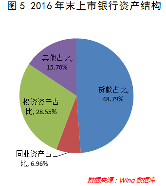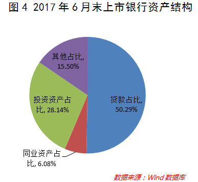 从资产结构看,上市银行贷款规模占比有所提高——贷款占比从2016年末的48.79%提升至2017年6月末的50.29%;投资资产和同业资产占比有所下降——2017年6月末,投资资产和同业资产占总资产的比重分别较2016年末下降0.41个百分点和0.88个百分点(参见图4和图5)。