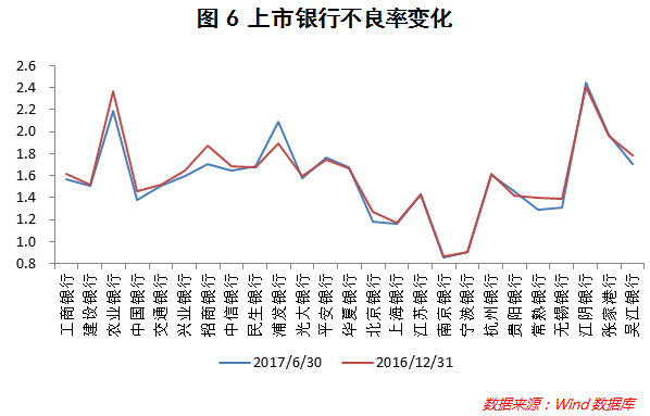 从资产质量看,2017年6月末,上市银行整体不良率均值为1.58%,较2016年末同比下降0.04个百分点,资产质量持续好转。分银行看,2017年6月末大部分银行的不良率较2016年末均有所下降,仅7家银行的不良率略有上升(参见图6)。