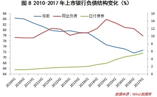 近年银行负债结构发生变化较大,存款规模占比下降,主动负债(同业负债、同业存单、二级资本债等)占比提高。2017年上半年,上市银行存款规模占比72.07%,同比下降0.44个百分点,居民和企业财富不再局限于一般性存款,而是转换成为理财、信托、同业负债等。