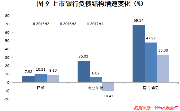 2017上半年,上市银行总负债同比增长9.79%,增速较去年同期减少0.28个百分点,负债增速基本上保持与资产增速同步增长。