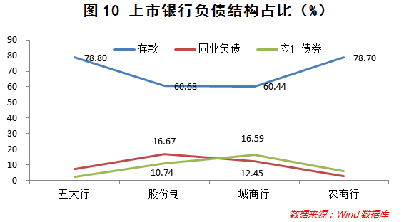 比较五大行、股份制银行、城商行和农商行,负债结构差异比较大。具体来说,五大行和农商行的存款占比高,超过78%;股份制银行和城商行的存款占比相对较低,分别仅占总负债的60.68%、60.44%。
