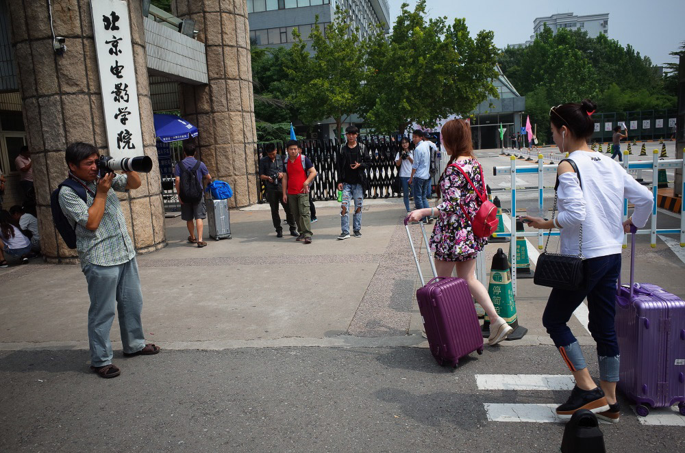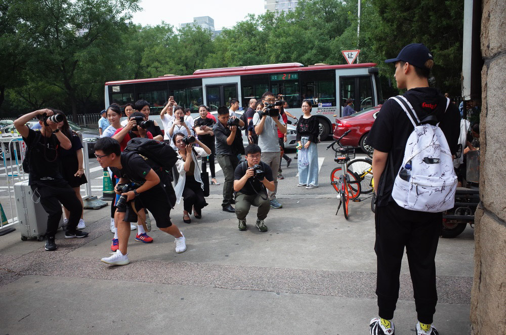 北影校门紧挨西土城路辅路,可供活动空间范围狭小,再加上为了送新生报道而随时停靠的社会车辆和私家车,场面时常变得混乱不堪,但这一切并没有影响到“长枪短炮”和各路媒体对新生的“礼遇”。现场最常见的流程是,各路媒体先对同一个新生轮番进行采访,然后摄影爱好者们再来拍摄。其中,中老年摄影爱好者们酷爱连拍,看得出来他们很享受这种“捕猎”般的快感。然而,现场王俊凯的粉丝一无所获,因为王俊凯始终没有现身。