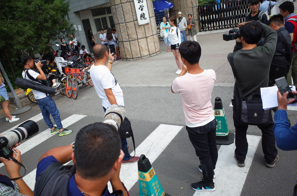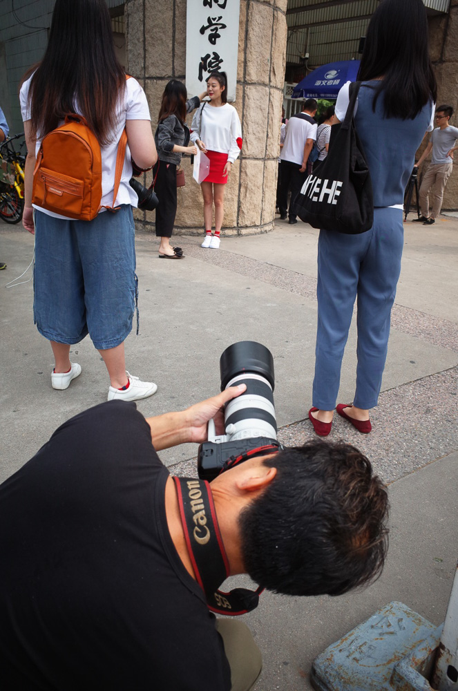 说是TFBOYS的王俊凯也会去,不过这一天学校似乎早有准备,没有录取通知书不让进校门。后来我和纪念品商店的店长聊天得知,去年新生报到并不设卡,可以自由进出校园。作罢,只能在门口徘徊,观察一圈发现,门口拿相机的有三类人:媒体、中老年摄影爱好者、以及王俊凯的粉丝。