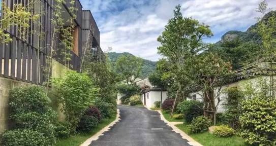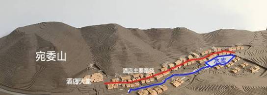 这是兰亭安麓酒店的入口处,古建与新筑分立在道路两侧。中间道路上的锯齿状的街缘石宛如中式服装上的盘扣,这种用服装设计的手法用于现代道路铺装景观上,有着奇异的和谐感。在小街上遥望群山,世外桃源之感油然而生。