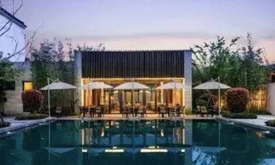 兰亭安麓的室外泳池目前还在建造中。用泳池位于SPA与太极馆旁,与白墙黛瓦的徽派建筑,层次丰富的植物相映成趣,配以水中的倒影,心中欢喜。