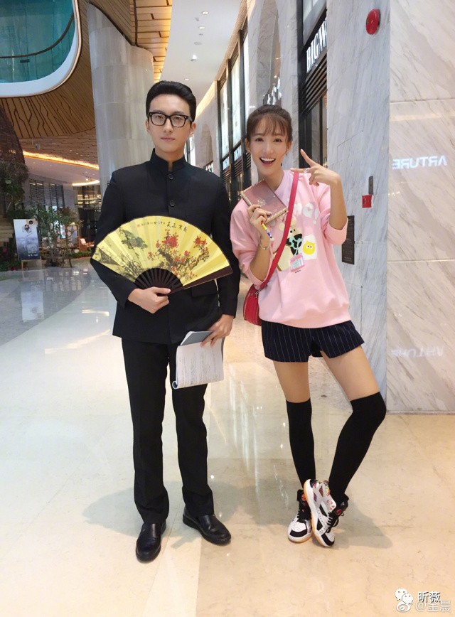 和一本正经扮演老干部的牛俊峰一起合影,自己却不顾形象像个和偶像合影激动的小粉丝。