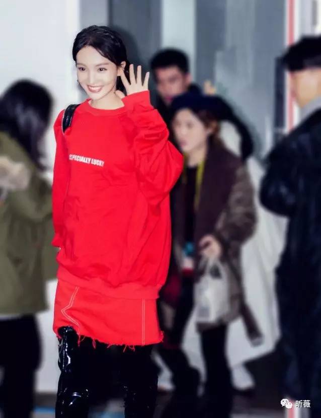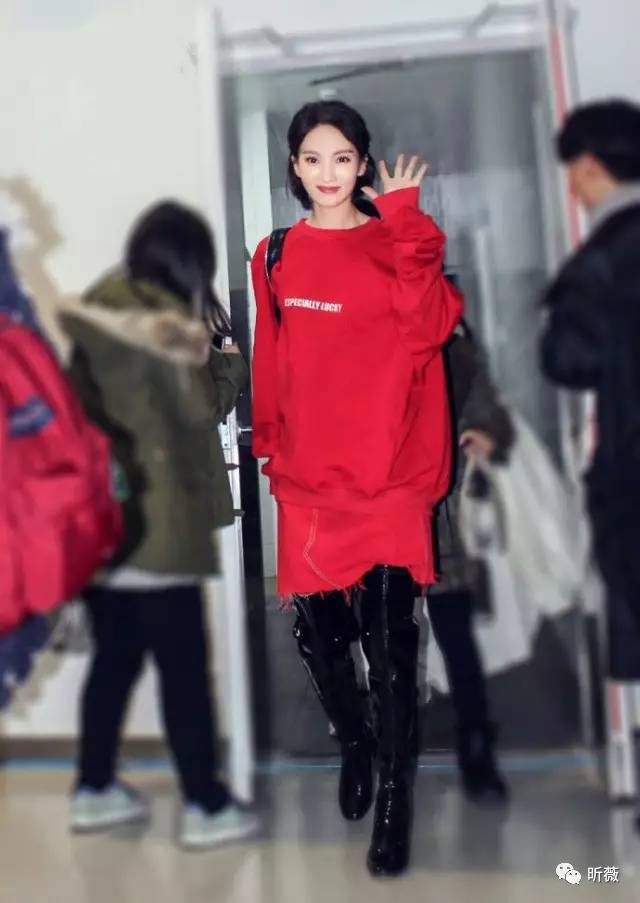 红色的宽松卫衣搭配红色牛仔短裙,下身选择一双具有皮质光泽的裤靴,潮范十足!