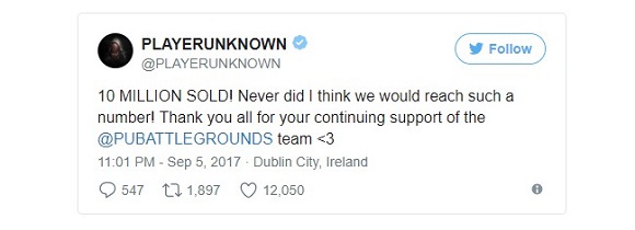 《绝地求生:大逃杀》可以说是2017最让人惊讶的游戏了。就在今天,该游戏销量已突破了1000万份,从500万翻番销量只用了两个月时间。