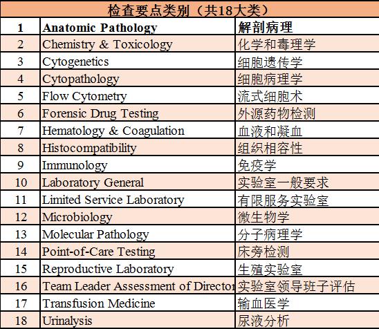 CAP现有18种评审检查要点,包括:解剖病理、化学和毒理学、细胞遗传学、细胞病理学等,申请CAP认证的实验室上报所开展的试验项目和所属专业小组后,CAP会为每个实验室量身定做好与其服务范围相符合的评审检查要点。