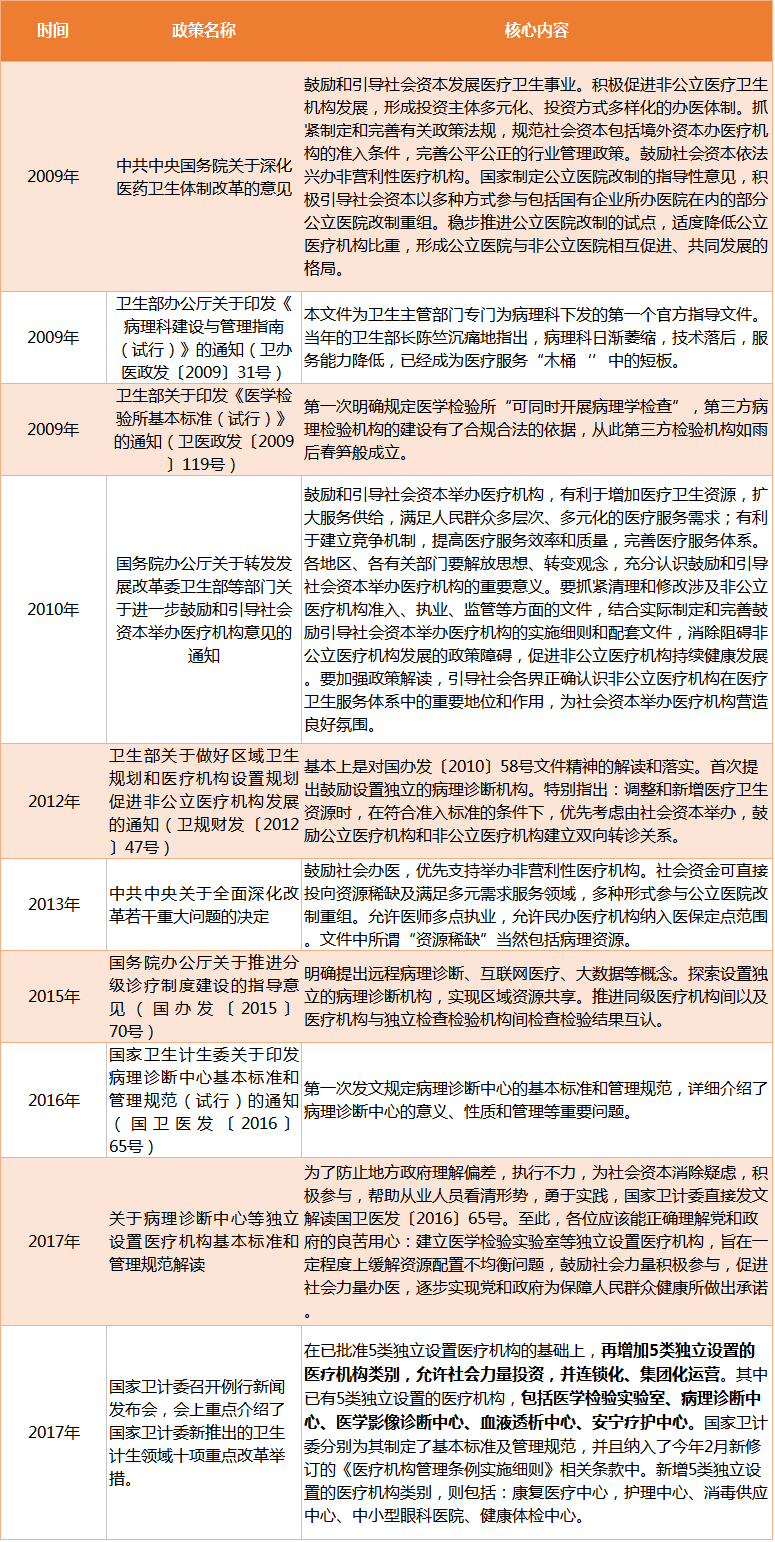 而在中国,随着国家卫计委陆续发布了关于鼓励社会办医、落实病理诊断中心基本标准和管理规范通知等多部鼓励病理发展的政策。具体如下: