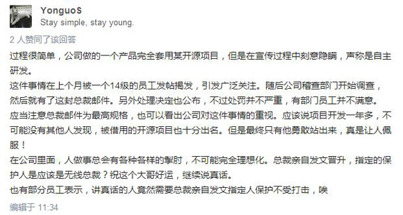 最初的起因到底是什么?从知乎回答及一些了解内情的员工处记者了解到,事情源于华为内部某产品线只是汉化了某开源项目,却在宣传中美化包装,声称是自主研发的成果,并在数位员工发现并提出质疑后并不认错。无论是2017年3月内部论坛的怀疑帖,还是7月有人直接对相关人员的质问邮件,都遭遇过糊弄、删帖甚至强硬回怼。最终是较真的梁山广,顶着压力坚持揭发,才有了公司稽查部门介入调查和处理结果。