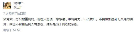 9月6日下午14点多,梁山广也补充了自己对这段经历的感受和解释。大意是一切所作所为都是坚持初心和码农本色,会继续努力以报答公司的支持。而在此前4日晚上,他也曾在内部论坛谢谢同事支持,并透露“领导说了会给我较长的保护期让我来适应新角色,大家不要再担心我啦。感谢正直的大家们。”