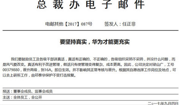 9月4日,华为内部心声论坛上贴出了一封由总裁任正非签发的邮件。虽然内容只有寥寥数语,背景和带来的影响却都不小。先来看看这封名为《要坚持真实,华为才能更充实》的邮件到底说了些什么: