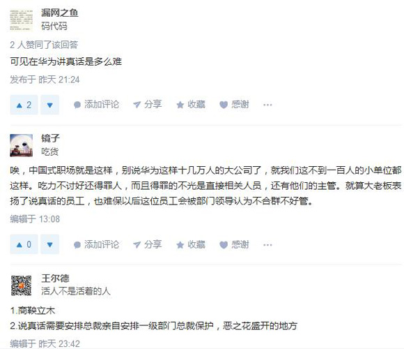 不仅是梁山广的勇气和坚持得到了同事们的敬佩,公司也赢得了不少民心。围观的职场人也赞扬了华为的内部风气。