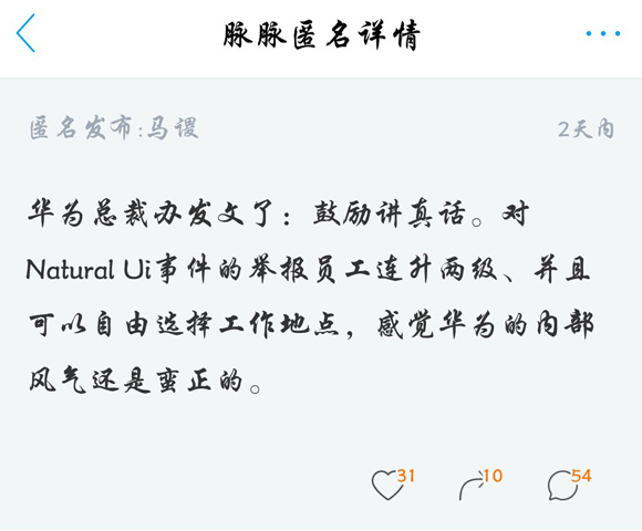 更值得玩味的是这种行为的可贵。有真话就有假话,有被保护者就有施加报复者。该邮件本身并未说明具体的事件背景,也没有提及另一方身份及相关处理措施。但这些并不是说不存在。实际上内部确实存在一些不满意之声,认为“冻结相关人员升职加薪半年”的处罚过轻。而另一方面,哪怕在一贯把业务造假列为高压线的华为,普通员工仅因为坚持说出了事实,不但要在揭发过程中遭受压力,在公司调查清楚真相后,还需要总裁特意明确指定一位高层作为保护人来防止打击报复。