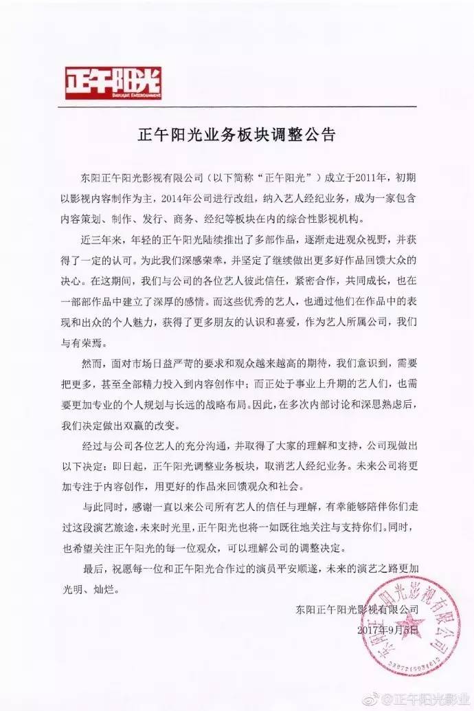 关于取消艺人经纪业务的原因,正午阳光在公告中给出的官方解释是:“面对市场日益严苛的要求和观众越来越高的期待,我们意识到,需要把更多,甚至全部精力投入到内容创作中;而正处于事业上升期的艺人们,也需要更加专业的个人规划与长远的战略布局。”