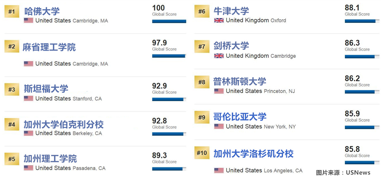 究竟各榜单有何特色又偏重什么呢?以三个机构最新发布排名来看,我们发现QS榜单的英国高校数量最多,剑桥、牛津、伦敦大学学院和帝国理工都名列榜单之上。而USNews排名中只有两所英国高校——牛津与剑桥,其中最好的排名也仅在第六位(牛津)。
