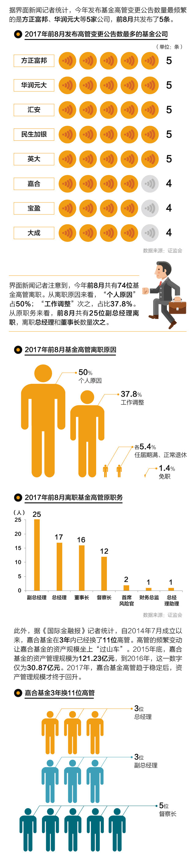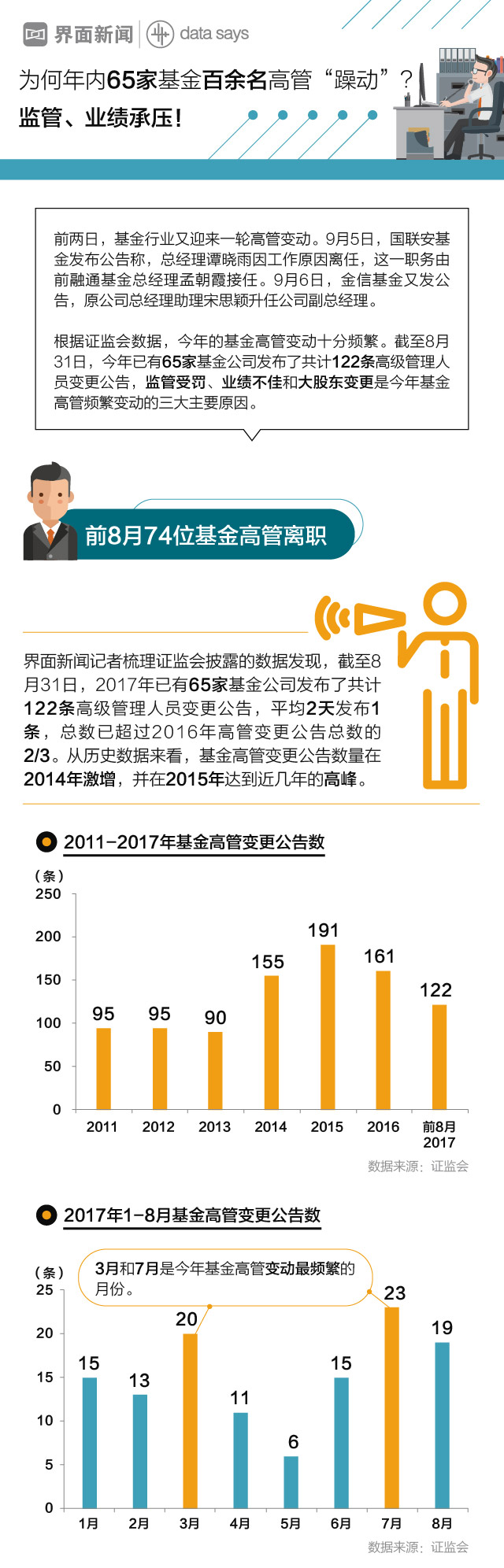 截至8月31日,2017年已有65家基金公司发布了共计122条高级管理人员变更公告,平均2天发布1条,总数已超过2016年高管变更公告总数的2/3。