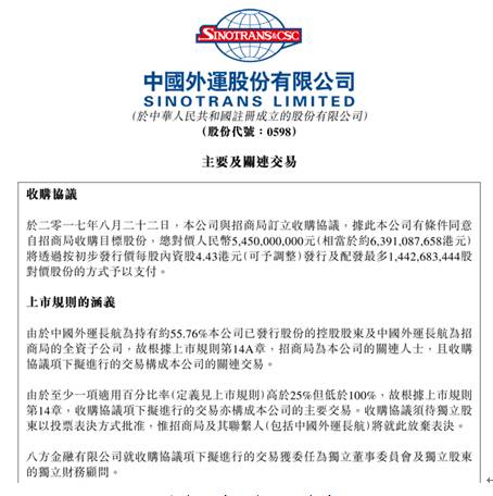 近日,中国外运股份有限公司(以下简称“中国外运”)发布公告,公司与招商局订立收购协议,拟以人民币54.5亿元收购招商局物流集团有限公司(以下简称“招商物流”)的全部已发行股本。