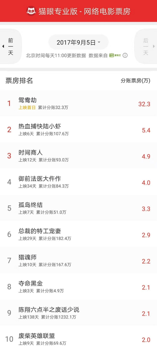9月6日,在2017上海网络视听季暨第九届中国网络视听产业论坛上,爱奇艺宣布与猫眼电影深度合作的“爱奇艺网络大电影票房日排行榜”将陆续在安卓和苹果的各应用市场上线,届时用户可通过下载新版本的猫眼专业版APP,查阅到这一排行榜数据。