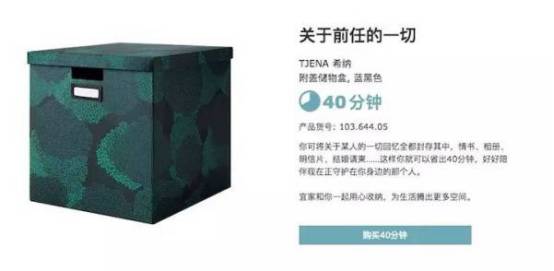 而除了在讲空间之外,宜家最近开始在对消费者讲述他的“省时功能”。希望向消费者传达:因为空间的有效利用,让你的生活井井有条,不至于因杂乱无序的摆放而耽误时间。对此,宜家把它的产品名字都用使用场景进行了代替,比如,这个白色衣架的名字是:再多睡一会儿吧,产品价值为15分钟;蓝黑色储物盒的名字是:关于前任的一切,产品价值为40分钟。
