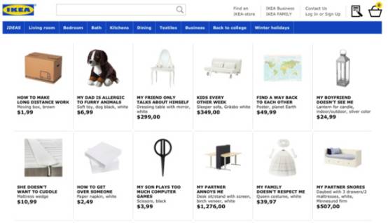 他们将产品重新命名,做了一个SEO小游戏。就是将谷歌上搜索最多的一些问题作为宜家产品的名称,比如如果你搜索“我女儿天天晚上都出去玩”,搜索出的产品会是一个酒吧的球灯,如果你搜索“我的男朋友惹我生气了”,搜索出的产品会是一个由墙隔开的双人桌。