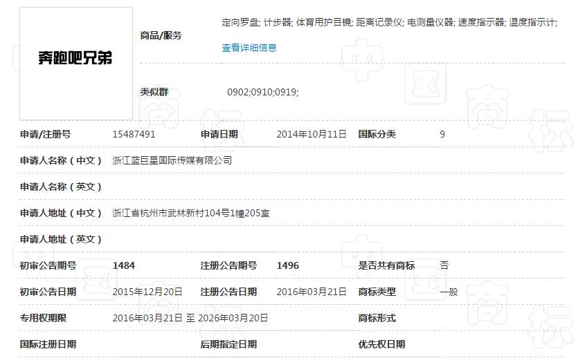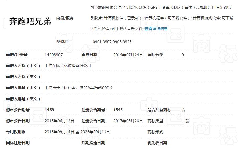 高沃小知从商标局查询得知,上海午际公司在2014年7月24日提交了“奔跑吧兄弟”第9类商标的注册申请,比正主浙江蓝巨星公司2014年10月11日早提交了2个多月成功注册了下来。